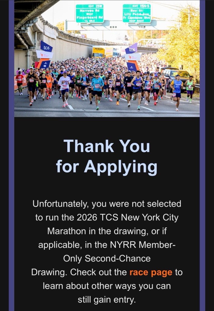In other news… the NYC Marathon ballot results were out yesterday. Unfortunately, I was not part of the 1% they accepted. 1% acceptance rate. Ridiculous. Oh well, next time. Can’t be greedy, only one good result a week please.