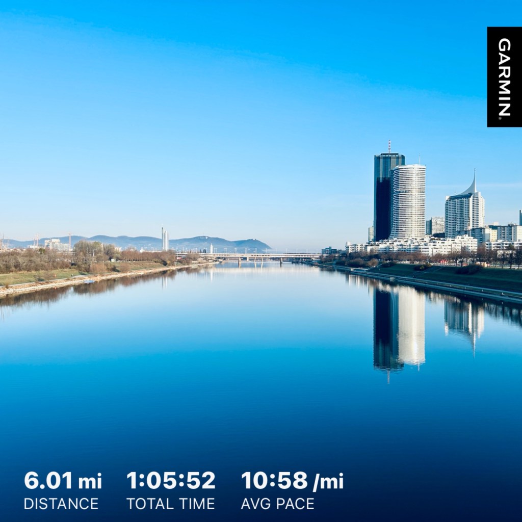 Being in a different city would not be complete without a run. Although I didn’t really get far or run around the sights or parks, I made sure to run by the Danube. One of the chaps in my group managed a 13 mile run around the Danube Island and the city. I wasn’t as keen, my 13-miler will be this Sunday. So in addition to my sneaky 4-mile treadmill run in between workshops, I got up at 6 am on Friday, skipped the breakfast buffet and went for a 6 mile run around Danube Island – which is a 13 mile car-free island. I managed to get back and showered before the 8 am start.