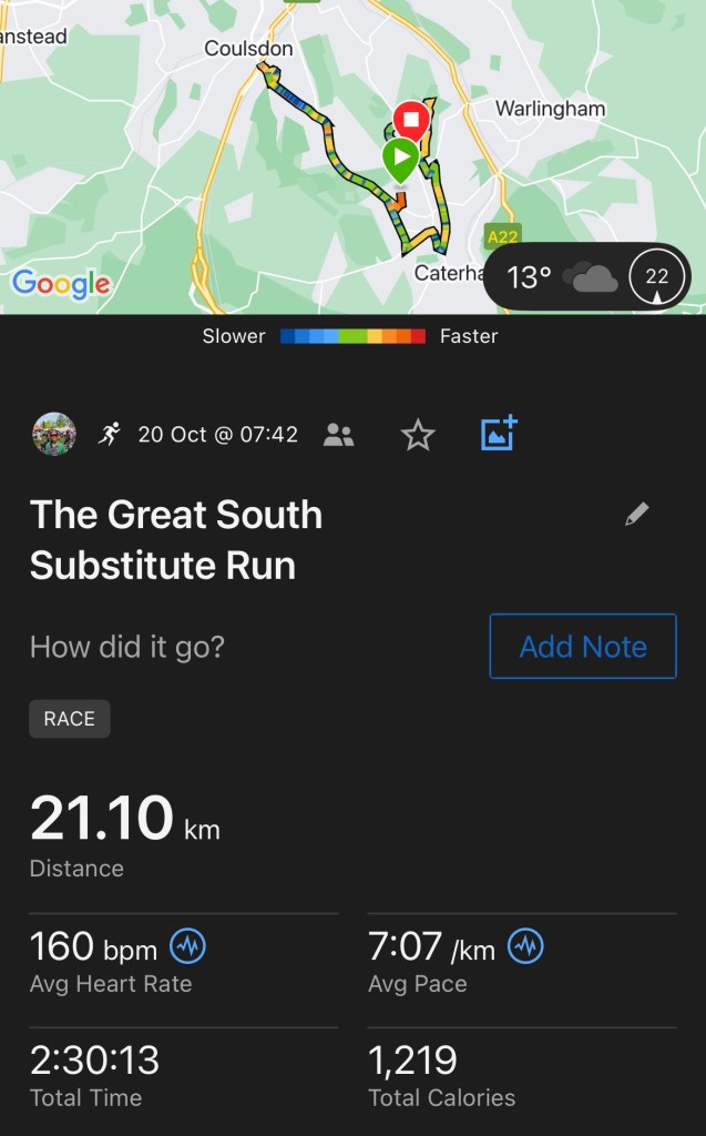 What I wasn’t ready for and didn’t train for was the Surrey Hills. I started off comfortably, possibly under 6min/km but slowly realised that I was committing myself go down Coulsdon Hill which only meant that I had to go back up it again. Of course, I had to do it. But my legs were on fire when I got back up and it took me a slow 5k run and a Lucozade to recover. Hit several walls but powered through. Back up the hill, I was running towards my usual route, the Kenley Aerodrome when I hit 10 miles (16 km) at 1hr 53mins – blame it on the hills. I had to keep going because I was meant to do 23 km for training. Stopped short at 21.1 km (half marathon).