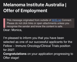 Thursday morning (usual 5 am), there it was. After confirmation that all 3 of my references had responded, I was offered a fellowship post at the Melanoma Institute Australia for January 2027. The Finish Line.