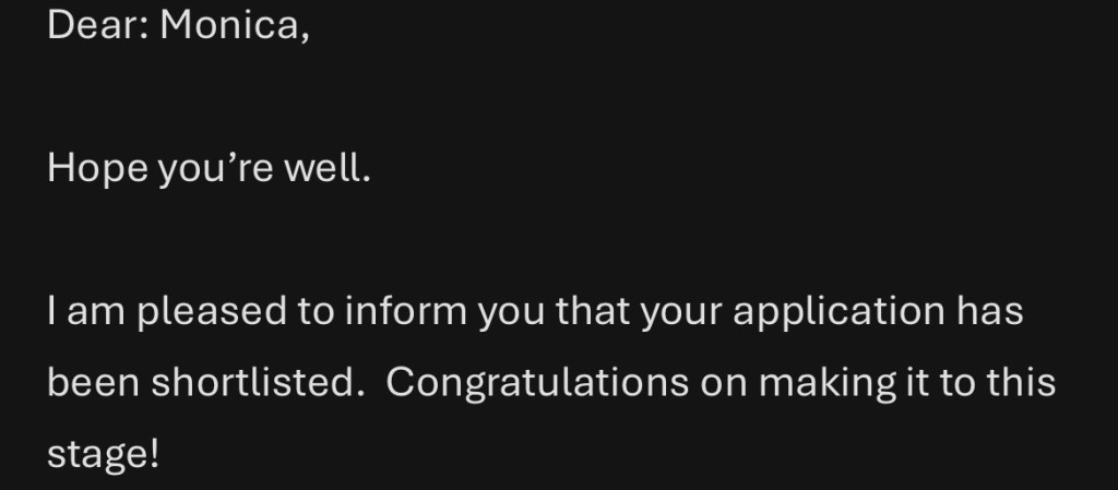 That Friday, 5 am, ‘another congratulations to getting to this stage’ email… ‘please let your references know that we are about to get in touch with them.’ OMG. What does this mean? Was this it? I was an idiot and responded ‘will they be interviewing the references too?” I also asked Andrea and he said, ‘you are in!’