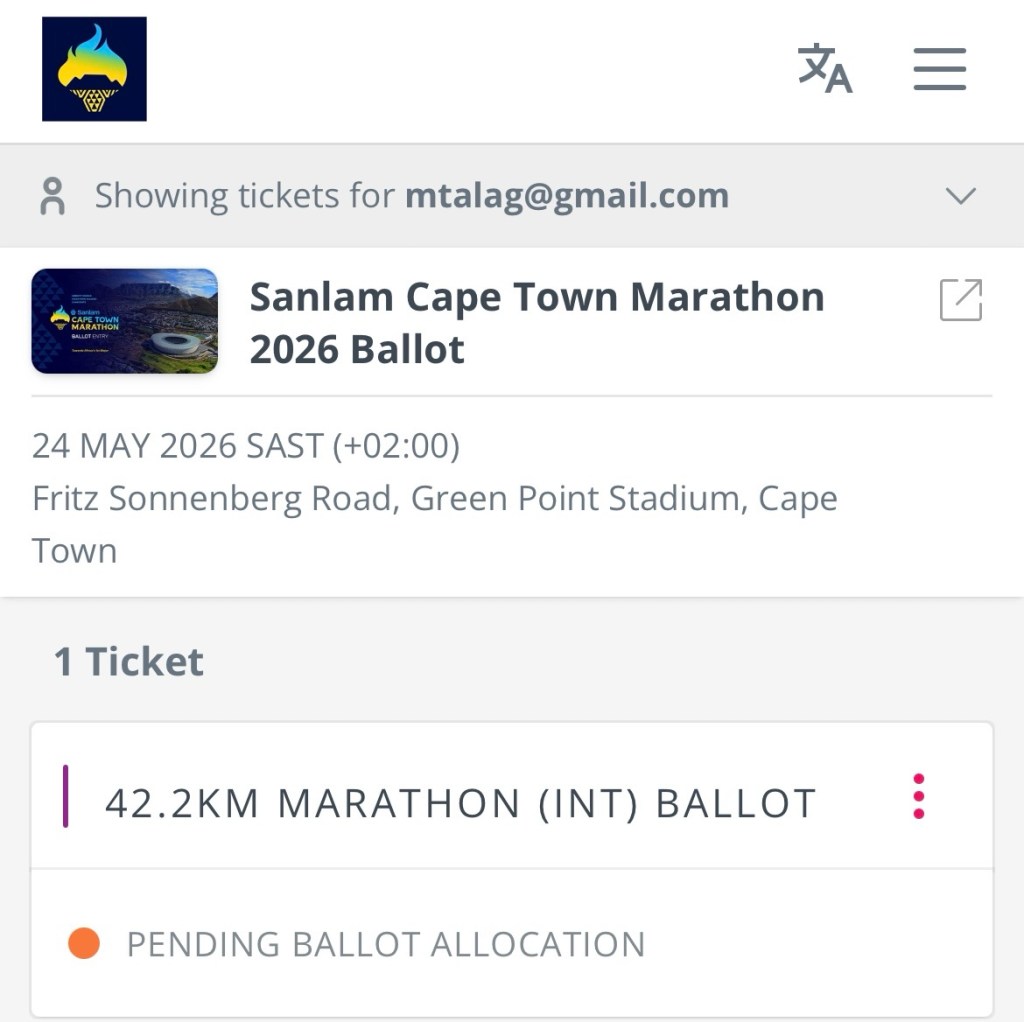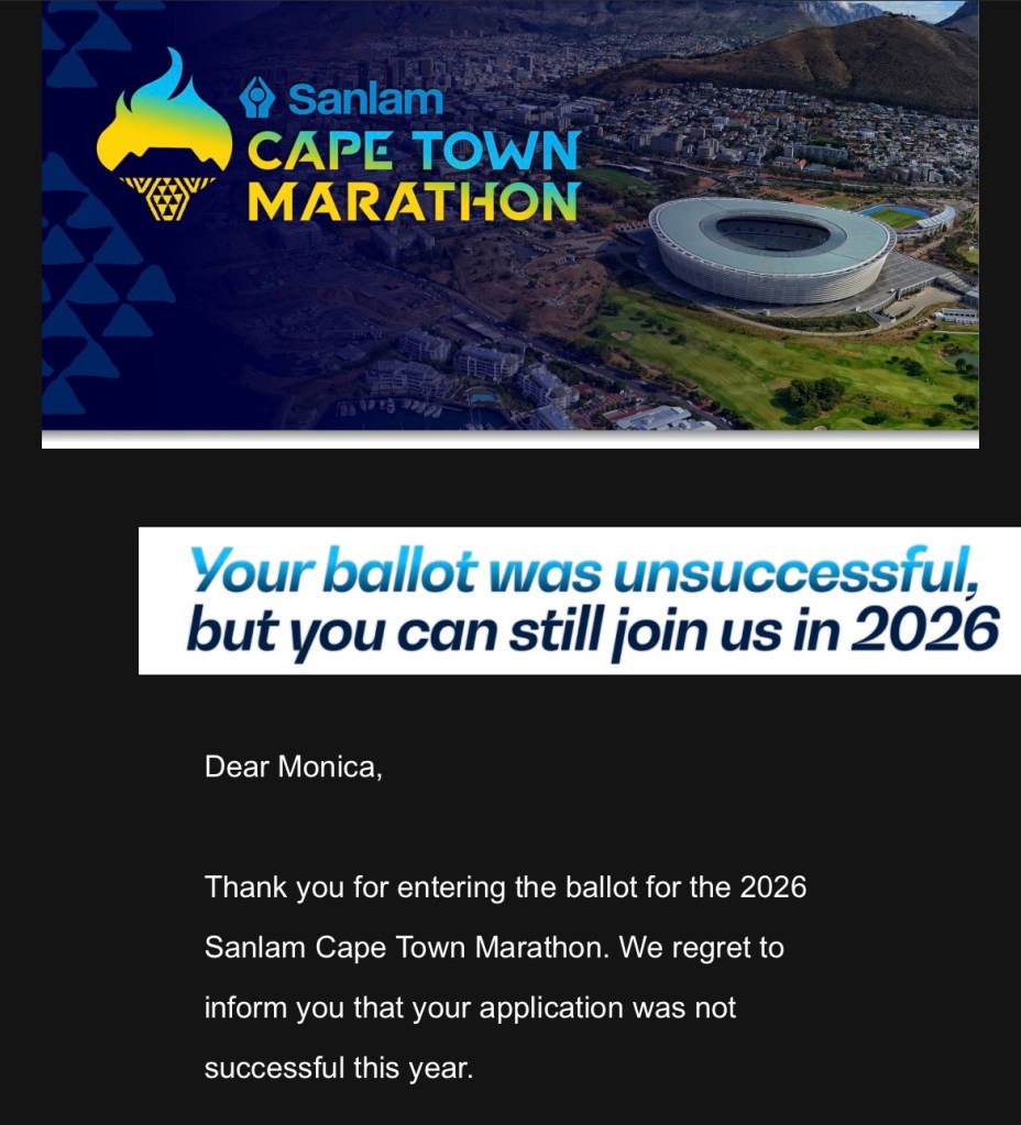 This week, the ballot results for the Cape Town Marathon came out. I signed up to it mid-November. Ballot Results day is always stressful. Always checking your email for a Successful or Unsuccessful email, checking your bank account for money deducted from your account, checking the Entry status on the account, checking what people are saying online. Pretty much for the 24 hours.