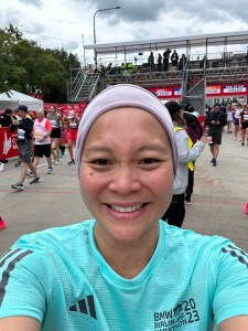 Key moments. 1) Early on, I established to follow the Blue Lines – the lines that the Elite runners follow, the exact distance and the shortest time to complete the race. This was my companion throughout, it allowed me to not weave through the other runners so much. 2) Though the crowd was not as electric at London, and not as many people were yelling out my name. I was excited to see some Filipinos, waving the Philippine flag, cheering on Filipino runners. So everytime I passed them, I yelled “Kabayan!!!” And they cheered! 3) There was also a time when I passed a little girl and her dad and they had a radio blasting “Shake it off” by Taylor Swift, which is one of Xavier’s favourite songs these days (the Sing version) then a few metres on, I saw a runner with Maya printed on her back. I got teary-eyed but had to snap out of it. I high-fived every little person who had their hand out! 4) Lastly, the best thing was seeing Yang Yang and Philipp 200 metres before the Finish Line. Earlier in the day, I had pinned a location so they could wait for me there, easy to recognise – half a mile before the Finish Line, on the right side. When I got to that corner, I didn’t see them! I got disappointed but had to carry on. Towards the end, I had already moved back to the middle, I hear “Niccccaaaaaa, Nicaaaaaa!” It was Yang-Yang, next to her Phillip trying to take pictures. I was screaming and crying and so excited! I gave them a quick hug and ran to the Finish. There’s video evidence of how bad my posture was towards the end. I also really thought I would beat my 4:37, but I had to wee.