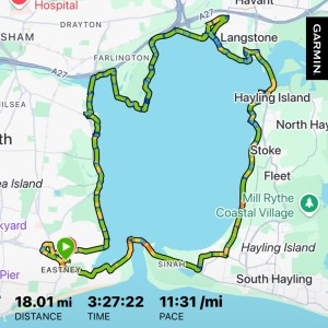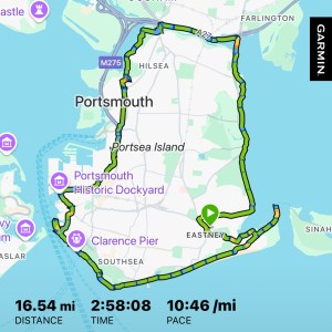 Also, this past weekend, I accomplished something I have always wanted to do since I started running in Portsmouth and that is… to run around the whole Portsea Island. Interestingly, on the Fastest Known Time website, the fastest unsupported female ran it in 2:58:51. Although it looks as though ran it 43 secs faster, I did stop the clock around Mountbatten to see the kids right after they were swimming. I was quite pleased about this.