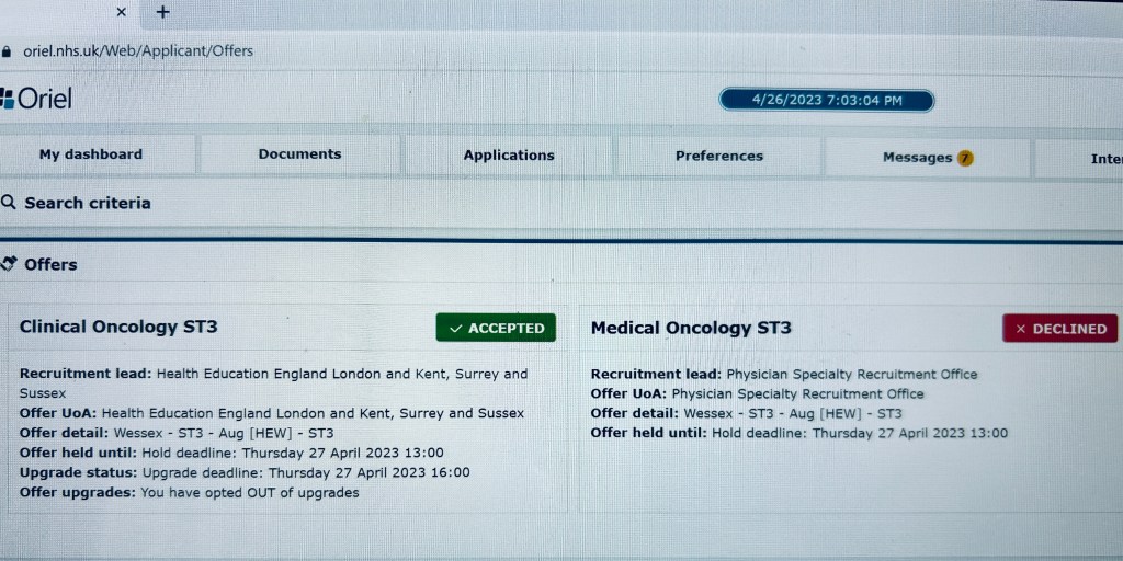 Monday afternoon – I found out that I didnt get an Oncology job offer. First, came the Clin Onc email and then the Med Onc. This didn’t surprise me as I didn’t rank highly. I might have half expected to not get an offer. Bummed but recovered quite quickly because I had mentally prepared for it. I would have just continue locuming and do a PgCert and apply again next time. But also, there are more rounds to go.