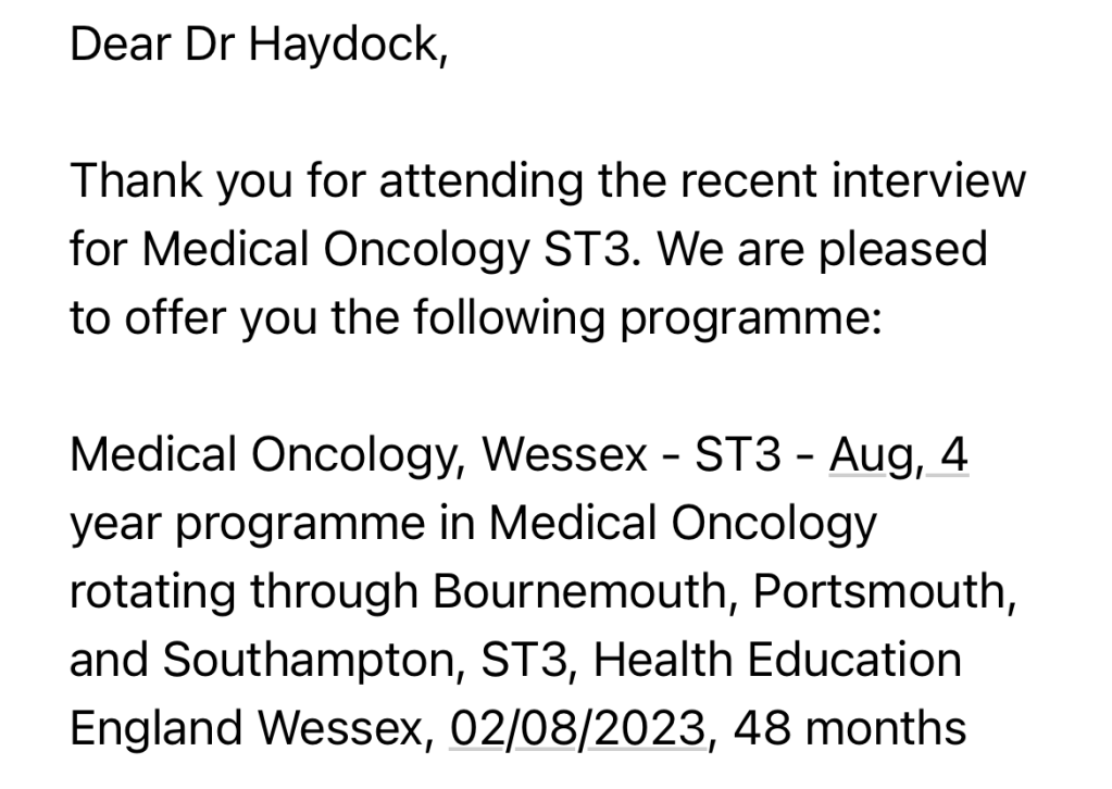Thursday. Whilst we were on our way to pick the kids up from nursery, David driving, stuck in traffic, I randomly checked my email. And there is was, out of nowhere, not expecting it at all… an offer for a Medical Oncology job! In Wessex! I had only ranked the Wessex jobs, a total of 10 places. And I finally managed to snatch one. I could have accepted the offer there and then but I decided to take a breath first. I’ve held the offer, wait this coming week if a Clin Onc job comes around. But OMG! I’ve got an Oncology Specialty Registrar post!